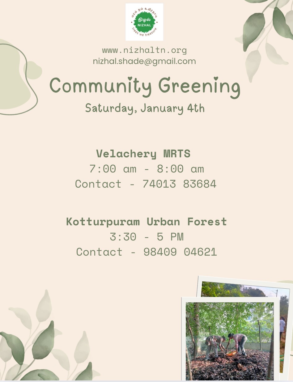 • Community greening at Velachery MRTS and Kotturpuram Urban Forest on Saturday 04 January 2025