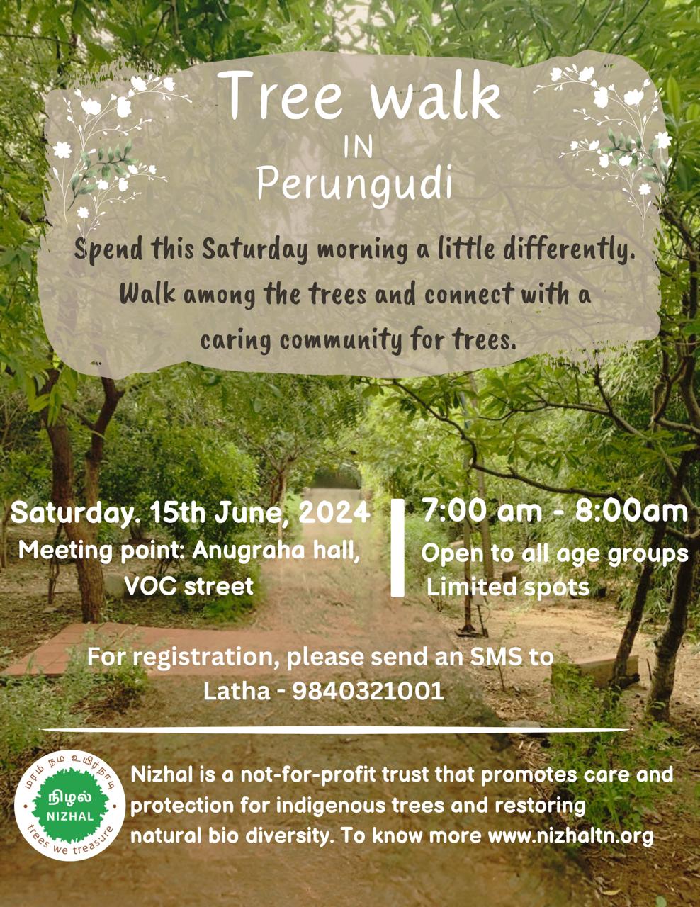 Tree walk in Perungudi. Spend this Saturday morning a little differently. Saturday 15th June, 2024. Timing: 7 am to 8 am. For registration call +91-9840321001