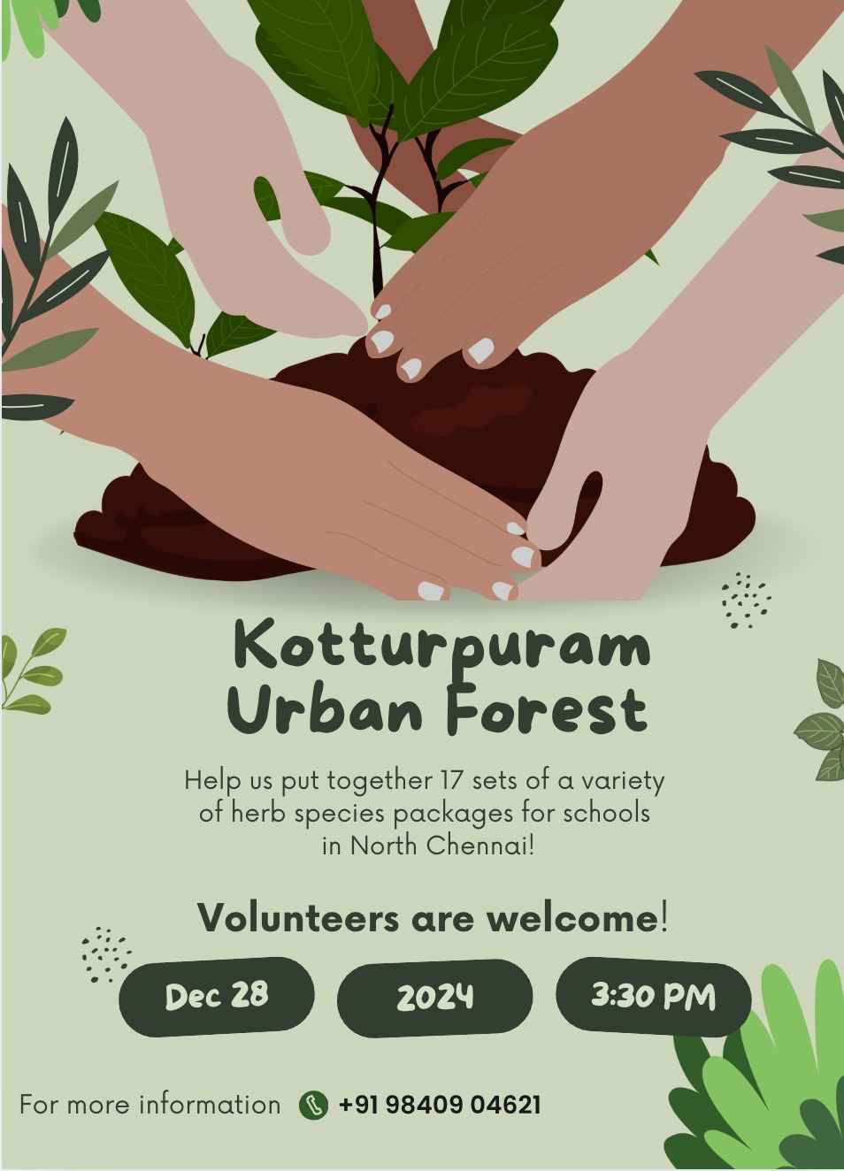 Volunteers are welcome to put together the herbs packages for schools. Location:Kotturpuram Urban Forest Date: 28 December 2024 – 03:30 pm